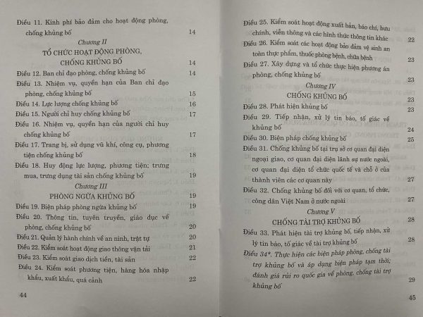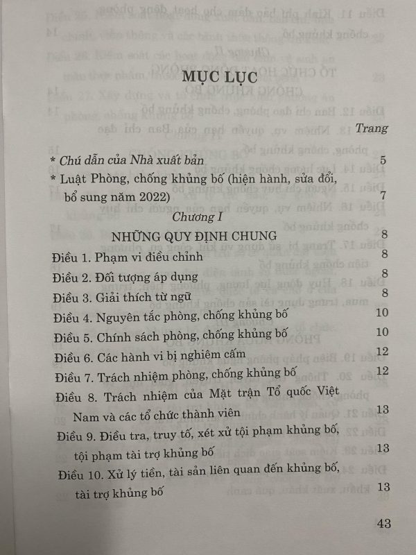 Cuốn sách là văn bản hợp nhất Luật Phòng, chống khủng bố năm 2013 với nội dung được sửa đổi, bổ sung từ luật Phòng, chống rửa tiền năm 2022
