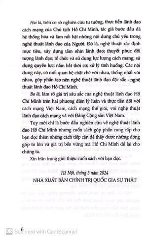 Ba là, làm rõ giá trị sâu sắc của nghệ thuật lãnh đạo Hồ Chí Minh trên hai phương diện lý luận và thực tiễn đối với cách mạng Việt Nam, cách mạng thế giới, với nghệ thuật lãnh đạo cách mạng và với Đảng Cộng sản Việt Nam. Tuy mới chỉ là bước đầu nghiên cứu về nghệ thuật lãnh đạo Hồ Chí Minh nhưng cuốn sách góp phần cung cấp cho bạn đọc thêm những cách tiếp cận để thấy được những đóng góp to lớn và giá trị bền vững mà Hồ Chí Minh để lại cho chúng ta.