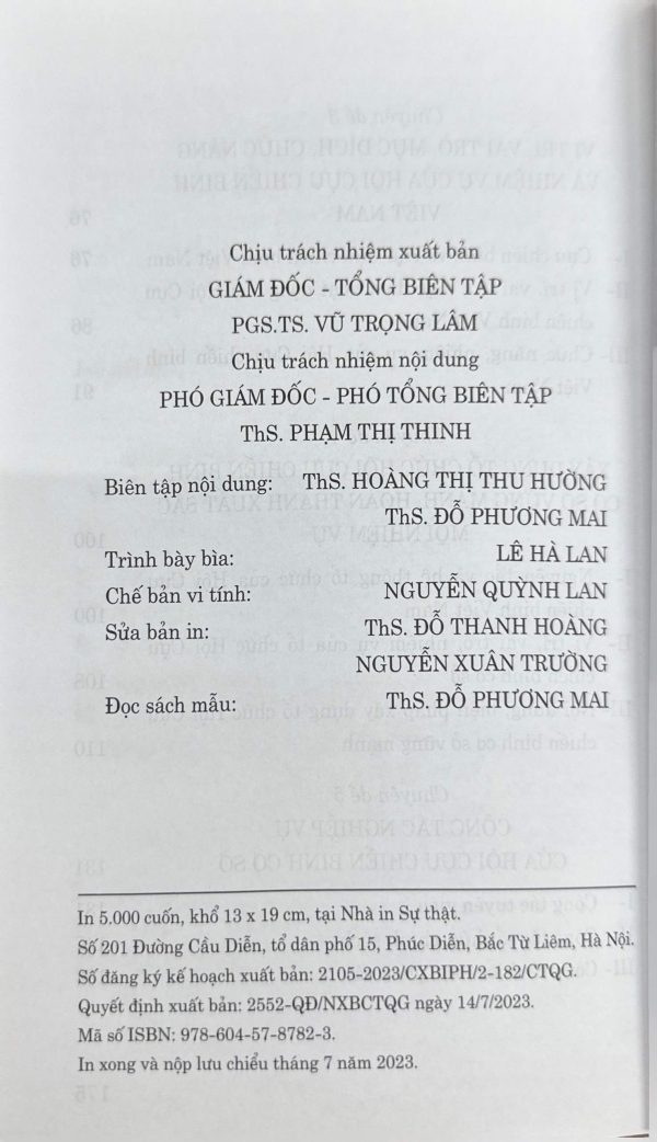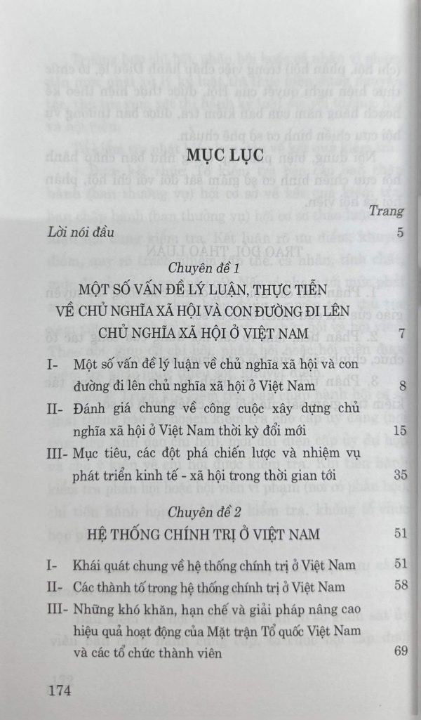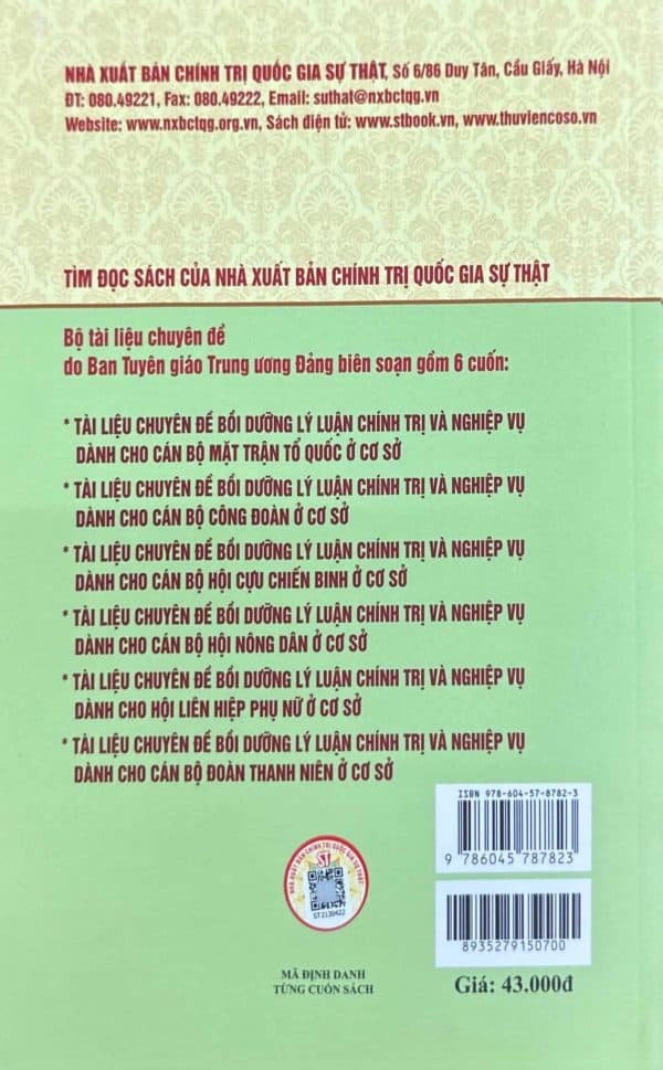 Tài liệu chuvên đề bồi dưỡng lý luận chính trị và nghiệp vụ dành cho cán bộ Hội Cựu chiến binh ở cơ sở ngoài 2 chuyên đề lý luận chính trị, các chuyên đề còn lại tập trung làm rõ một số nội dung về vị trí, vai trò, mục đích, chức năng nhiệm vụ, nguyên tắc và hệ thống tổ chức của Hội Cựu chiến binh ở cơ sở; biện pháp xây dựng tổ chức Hội Cựu chiến binh ở cơ sở trong sạch vững mạnh; một số công tác nghiệp vụ của Hội Cựu chiến binh ở cơ sở