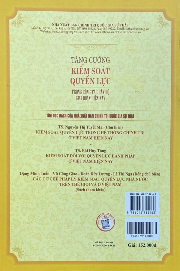 Nội dung cuốn sách tập trung làm sáng tỏ một số vấn đề lý luận về kiểm soát quyền lực trong công tác cán bộ; đánh giá thực trạng thực hiện các quan điểm chỉ đạo của Đảng hiện nay; kinh nghiệm kiểm soát quyền lực của một số quốc gia trên thế giới, từ đó đề xuất các giải pháp nhằm nâng cao chất lượng và hiệu quả hoạt động kiểm soát quyền lực trong công tác cán bộ ở Việt Nam hiện nay.